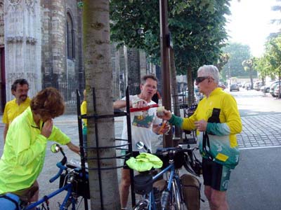 Rendez vous à bicyclette sur le parvis de la Collégiale de Mantes. Dany a prévu la bouteille de rosé dans son porte bidon et les galettes comme pot de départ.