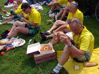 Le ravitaillement est prévu à PONT L'ÉVÊQUE, certains mettrons pied à terre pour rejoindre le centre ville tant les voitures sont pare-choc contre pare-choc, mais au préalable le message des organisateurs, qui remonteront le peloton à grands coups de pédales pour l'informer de ne pas prévoir de dessert.